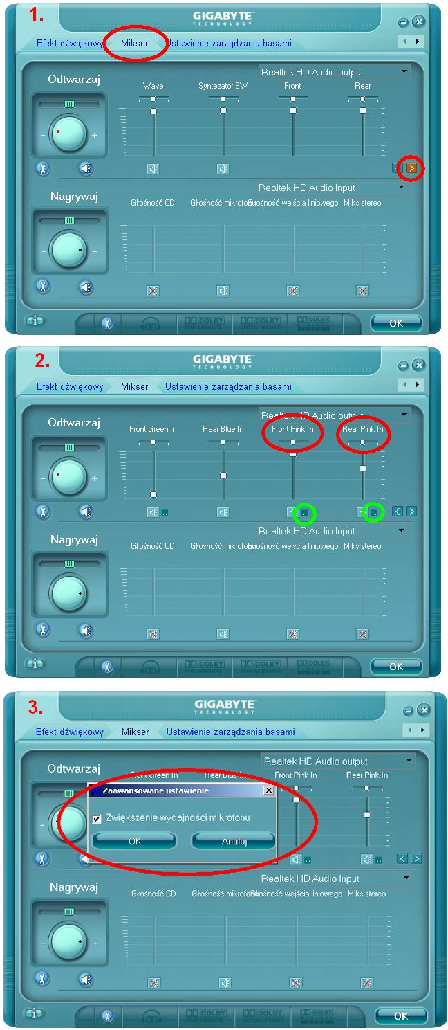 Aby włączyć boosta (zwiększenie wydajność mikrofonu) musisz: 1. Otworzyć Menadżer Realtek HD Audio (ikonka czerwonego głośniczka koło zegara) 2. Przejść na zakładkę Mikser 3. W panelu Odtwarzaj klikać na strzałki, aż ujrzysz: Front Pink In, Rear Pink In 4. W zależności gdzie podpiąć mikrofon czy do panelu przedniego (Front), czy z tyłu obudowy (Rear), klikasz dla wybranej opcji w malutki przycisk, który ma dwie kropeczki: .. 5. Bingo! Mamy to! :) Okienko do włączenia zwiększenia wydajność mikrofonu! Zaznaczamy i cieszymy się tym, iż nasi rozmówcy wreszcie nasz słyszą głośno!