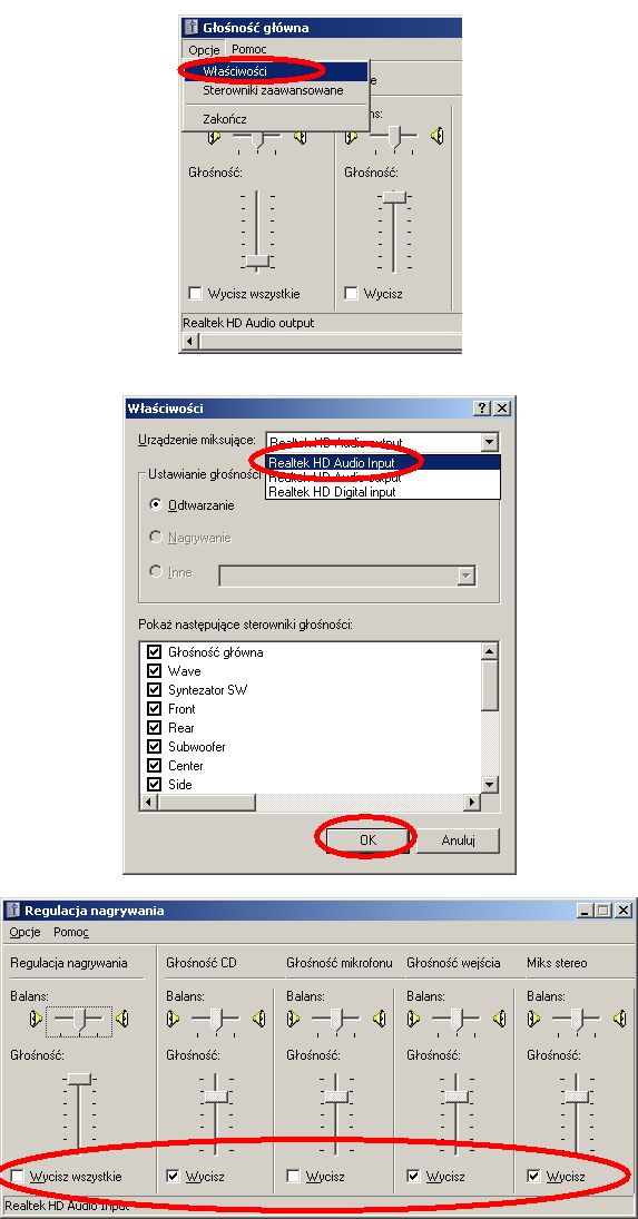 "Naprawa" dźwięku nagrywanego przez mikrofon (wyłączenie rejestrowania dźwięku z komputera np. dźwięk z gry, mp3 itp., na mikrofon: 1. Z meny start przechodzimy do folderu: Akcesoria -> rozrywka -> Regulacja głośności 2. W otwartym oknie z menu wybieramy opcje -> właściwości 3. W nowo otwartym oknie z comboboxa wybieramy Audio Input i klikamy na OK 4. Mając nowe okno wyciszamy wszystko oprócz: Regulacja nagrywania oraz Głośność mikrofonu 5. W taki oto sposób pozbyliśmy się nagrywania przez mikrofon inny dźwięków z komputera (mp3/radio/gry/ dźwięki systemowe i inne)