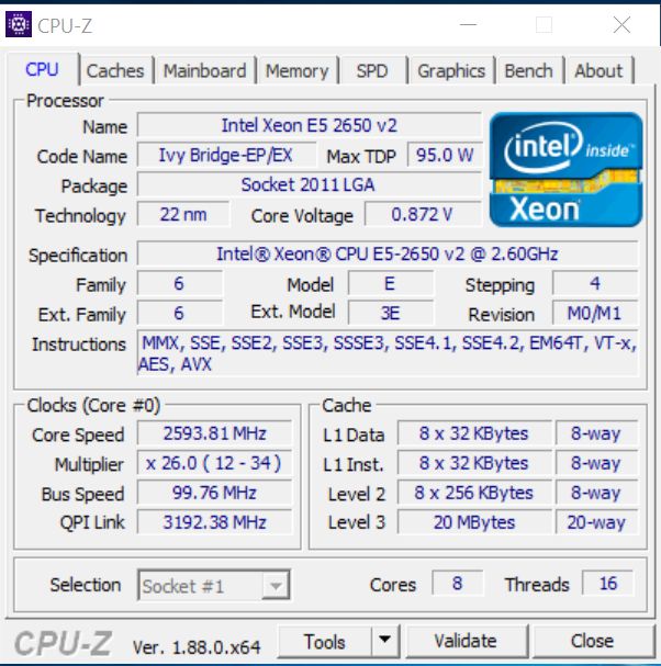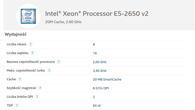 Ostatecznie zdecydowałem się na Xeona E5‑2650 v2. Osiem rdzeni, szesnaście wątków, taktowany zegarem 2,6GHz, (turbo do max 3,40 GHz), z 20MB cache, i TDP 95W, który przy okazji okazał się prawie o połowę tańszy od sześciordzeniowego odpowiednika, i kosztował mnie około 290 zł (w dniu premiery ten procesor kosztował ponad 1100$). Xeon E5‑2650 v2 został stworzony w 2013 roku w technologii 22nm, i wydany na podstawkę LGA 2011, która swoją premierę miała 14 listopada 2011 roku. Miała ona zastąpić poprzednie podstawki LGA 1366, LGA 1156 oraz LGA 1155, zapewniając większą wydajność nowoczesnym komputerom i serwerom. Podstawka ma 2011 pinów, i oparta jest na chipsecie Intel® X79 Express, który oferuje m.in. czterokanałowy kontroler pamięci, eSATA i PCI Express 3.0.Pewnie wiele osób w tym momencie puka się w czoło, po co w 2019 roku sięgać po tak starą platformę? No cóż, po pierwsze starsze Xeony wciąż oferują bardzo wysoką wydajność za niewielkie pieniądze. Procesor który wybrałem może z powodzeniem równać się ze Core i7 wydanymi na nowiutką podstawkę LGA 1151, czy Ryzenami od AMD, kosztując na rynku wtórnym wielokrotnie mniej. W benchmarku Cinebench Xeon E5‑2650 v2 osiągnął wynik 1056 pkt, plasując się obok m.in. Core i7‑7700K (1068 pkt.), czy i7‑6700K (1041 pkt.). Wynik pojedynczego rdzenia to jednak zaledwie 94 pkt, co tylko potwierdza, ze ten procesor słabo sprawdza się w zastosowaniach gdzie liczy się wydajność pojedynczego rdzenia.