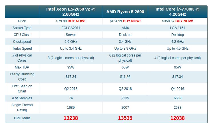 Pod uwagę brałem dwa modele sześciordzeniowego Xeona E5‑1650 v2 taktowanego zegarem 3.5 GHz, oraz ośmiordzeniowego Xeon E5‑2650 v2 o taktowaniu 2.6 GHz. Mniej wyżej taktowanych rdzeni lepiej sprawdziłoby się np. w grach gdzie najważniejsza jest wydajność pojedynczego rdzenia, a nie ich ilość ponieważ gry najczęściej i tak nie są w stanie wykorzystać dodatkowych rdzeni. Za to większa liczba rdzeni lepiej sprawdzi się w czasie renderowania 3D, edycji filmów, czy pracy na wielu aplikacjach.