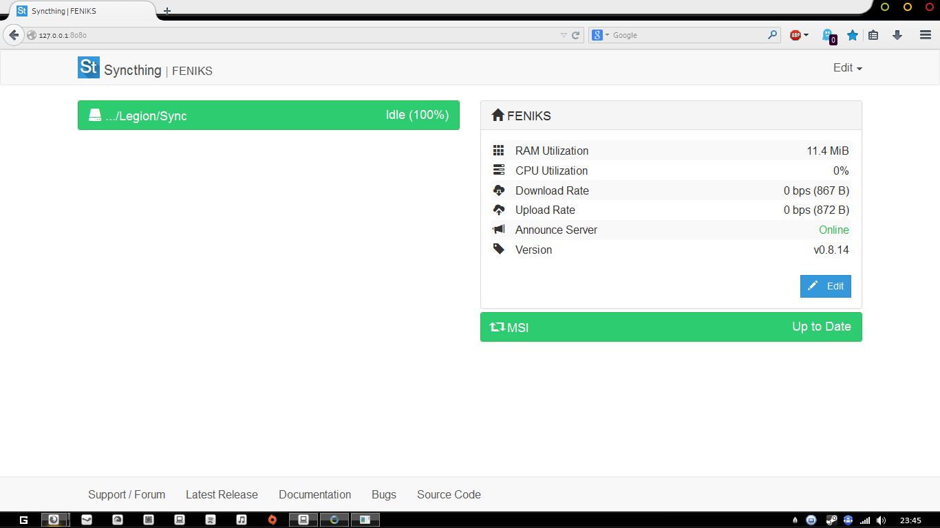 Instalacja jest prosta. Pobieramy wersję dla naszego systemu z tej strony klik a następnie rozpakowujemy pobrane archiwum i uruchamiamy plik "syncthing". Po chwili powinna uruchomić się przeglądarka internetowa i ujrzymy główny interfejs programu.