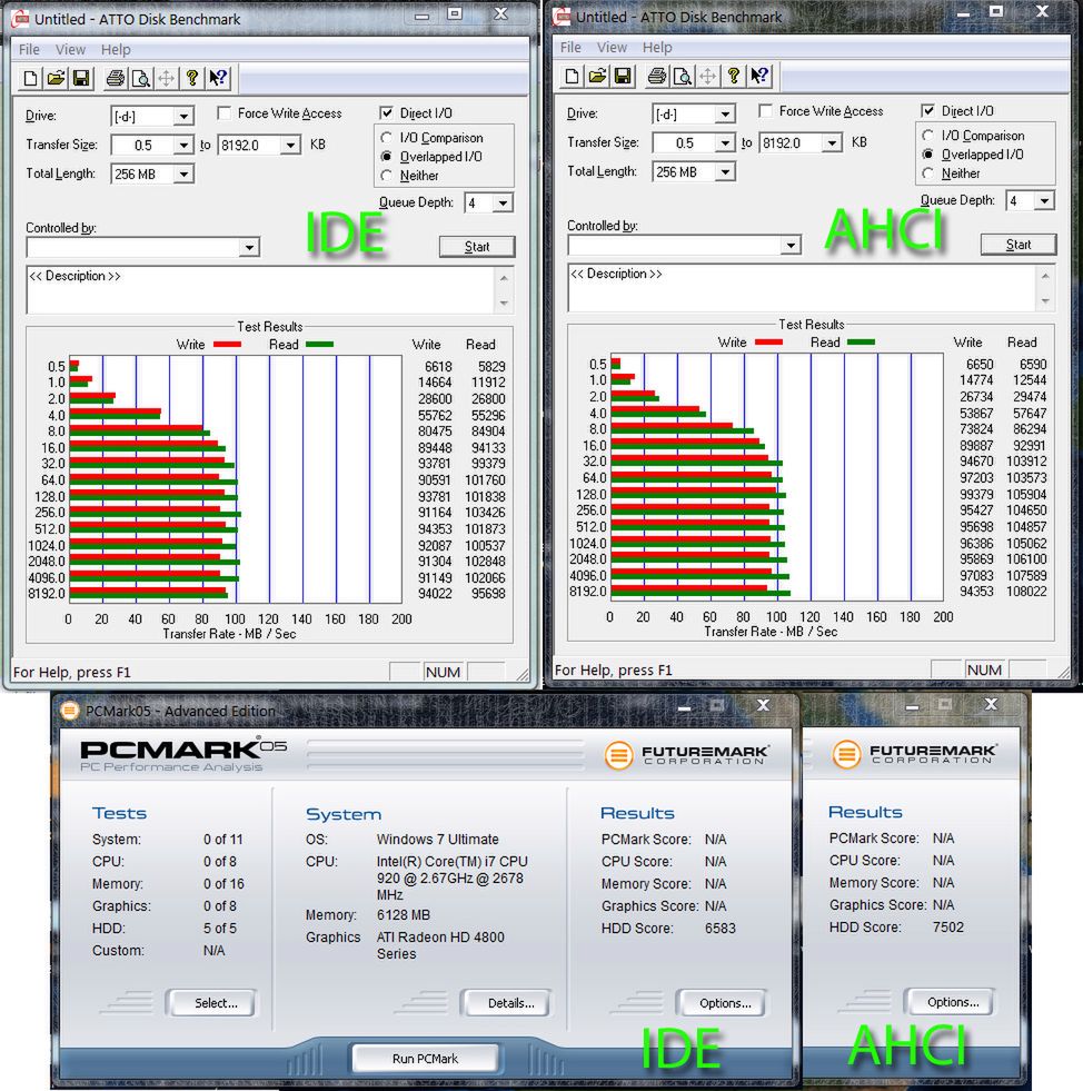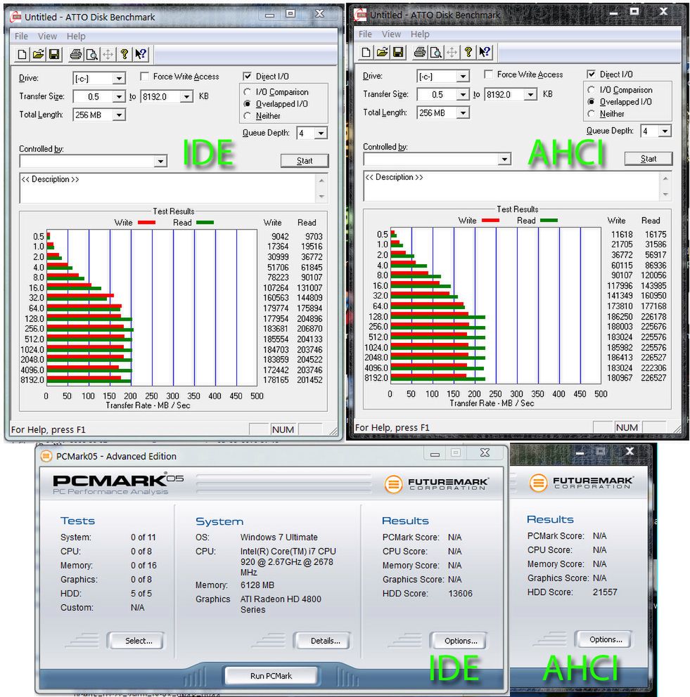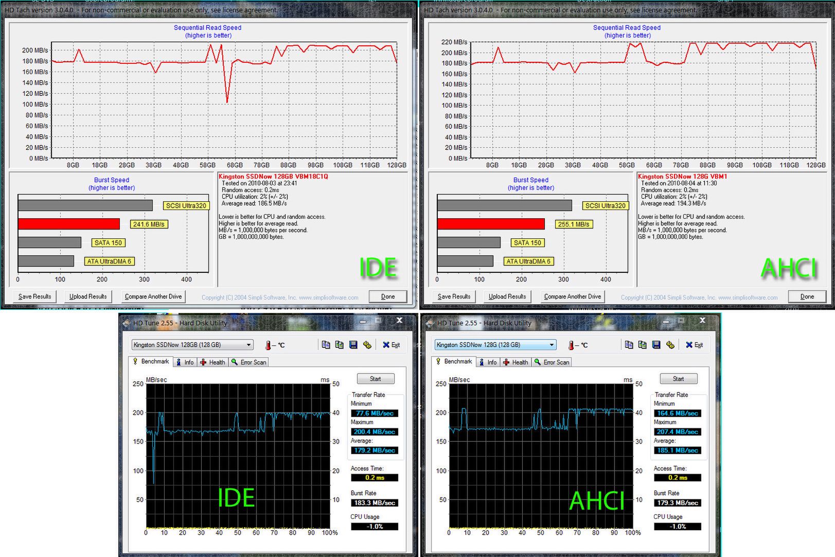 Zauważyłem coś dla mnie interesującego na filmiku otóż Panowanie z Kingstona testowali swoje dyski w trybie AHCI ? - a przeciętny Kowalski ma tryb IDE (bo ten tryb jest domyślmy w bios i raczej nikt tego nie przestawia) Porównywali tradycyjnego twardziela HDD 5400 rpm, który uzyskał z PCMark05 w teście HDD 4674 punktów z dyskiem Kingston SSDNow Series M G1, który uzyskał 27690 punktów jak widać prawie 6x dysk SSD jest szybszy od HDD. Po zauważeniu tego szczegółu przypomniało mi się iż ja także mam tryb IDE ustawiony w bios i tak sobie pomyślałem iż jak Panowie z Kingstona testują w tym trybie nie dlatego iż on jest tylko nowszy lecz też szybszy bo chcieli pokazać jaki to jest ich dysk SSD szybki !