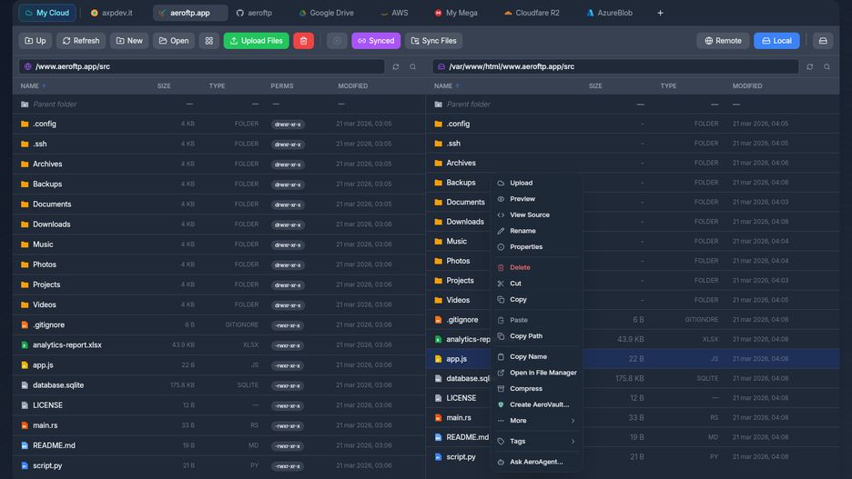 AeroFTP to nowoczesna aplikacja do zarządzania plikami, która łączy funkcje klasycznego klienta FTP z możliwościami znacznie szerszej platformy do pracy lokalnej, serwerowej i chmurowej. Program obsługuje wiele protokołów i usług, między innymi FTP, SFTP, WebDAV, S3, Google Drive, Dropbox, OneDrive, MEGA czy GitHub, dzięki czemu pozwala wygodnie pracować z różnymi źródłami danych w jednym miejscu.