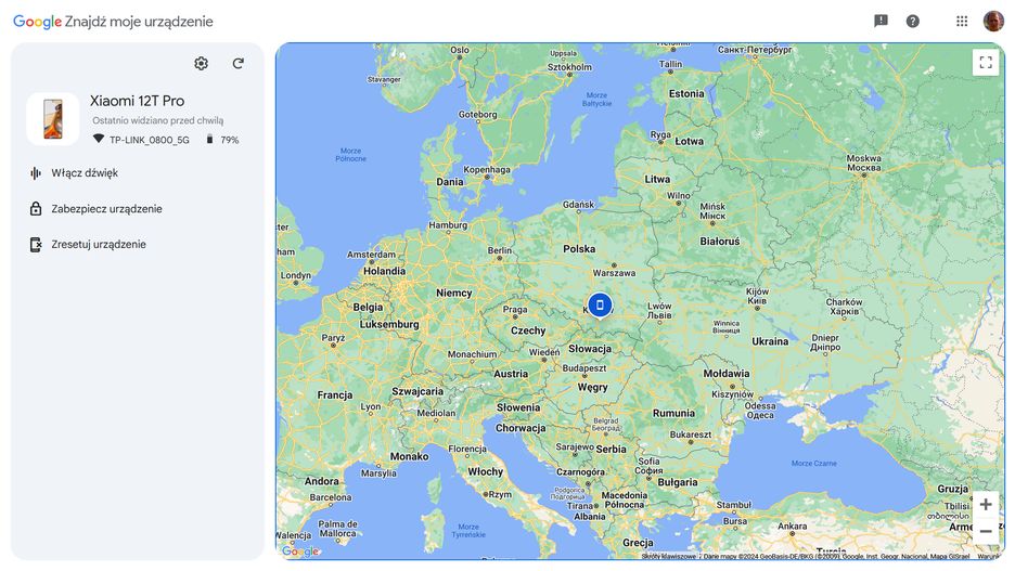 Na ekranie wyświetlona zostanie mapa z zaznaczoną lokalizacją smartfona z Androidem. Jeśli urządzenie znajduje się w domu i nie możemy go odnaleźć, z pomocą przychodzi opcja Włącz dźwięk. Po jej aktywacji na telefonie odtworzony zostanie sygnał dźwiękowy, który ułatwi jego lokalizację.