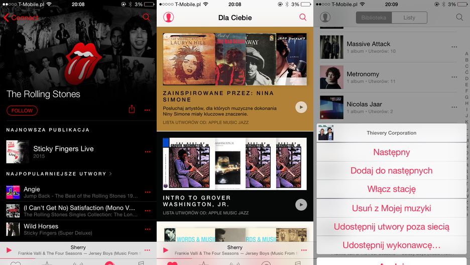 Jadę sobie dalej, muzyka gra, wiatr we włosach, bity z głośników takie, że mijane na światłach dziewczyny same wskakują do środka, aż tu nagle... znów... dźwięk się urwał. I tak co chwilę. Wygląda na to, że streaming Apple Music przez LTE w T-Mobile w centrum Wrocławia nie działa najlepiej. Dla porównania, Spotify nigdy nie przerywa mi przyjemności, buforuje odpowiednio do przodu i nawet w rejonach słabego zasięgu wszystko chodzi super. Apple Music z kolei nie dość, że co chwilę się rwie, to jeszcze ma problem żeby samodzielnie wznowić granie. Wyrobiłem już nawet nawyk klikania w stop i play, żeby szybciej wrócić do muzyki. Tragedia, takie akcje wcześniej miałem tylko z Androidem. Światowe media donoszą, że Beats 1 padło później całkowicie, ale w Apple Music przycina się niestety nie tylko radio.
