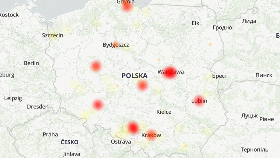 Problemy zgłaszają użytkownicy z różnych regionów Polski, w tym z większych miast takich jak Warszawa, Kraków, Wrocław, Gdańsk, Katowice, Łódź, Poznań oraz Lublin i Białystok.