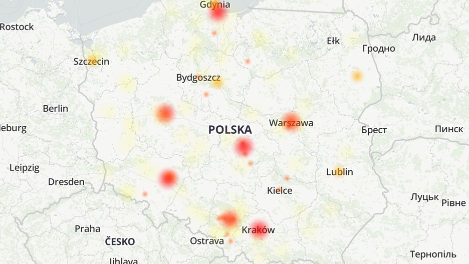 Mapa wskazuje, że problemy dotyczą użytkowników w różnych częściach Polski. Najwięcej zgłoszeń pochodzi z Krakowa, ale Gdynia, Warszawa, Wrocław i Poznań również się pod tym względem wyróżniają.