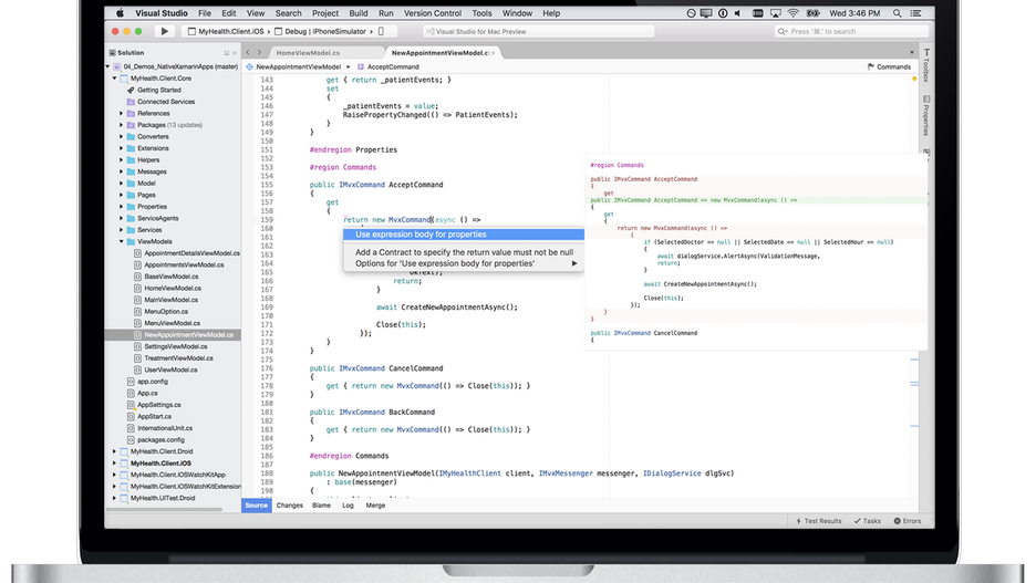Visual Studio Mac jest środowiskiem bardzo efektywnym i wygodnym, wyposażonym w mnóstwo dodatków przyspieszających programowanie. Można w nim łatwo badać struktury wywołań, powiązane funkcje i zbadać stan testów. Możliwości uruchamiania testów obejmują testy jednostkowe i zoptymalizowane testy interfejsu użytkownika.
