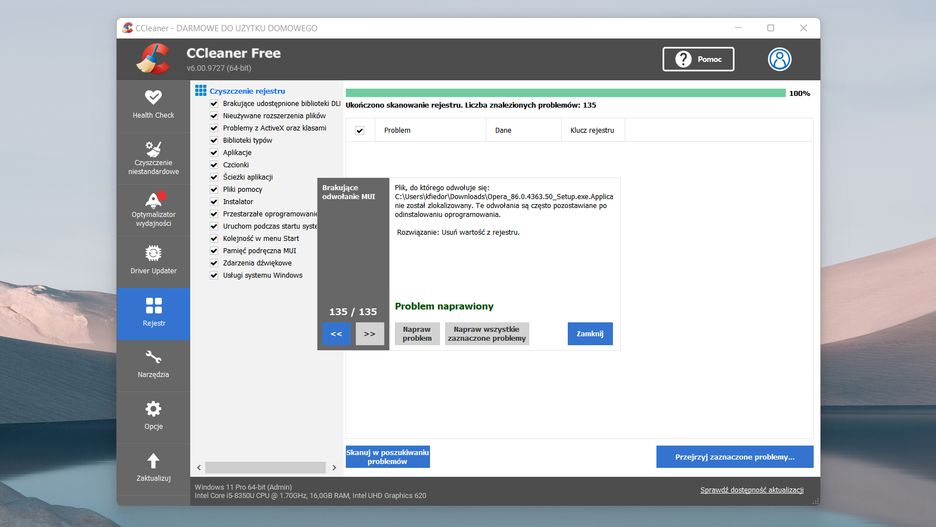 Po utworzeniu kopii wrażliwego pliku możemy przystąpić do czyszczenia rejestru. Możemy sprawdzać i usuwać pojedyncze problemy, lub klikając NAPRAW WSZYSTKIE ZAZNACZONE PROBLEMY zbiorczo usunąć błędne wpisy z rejestru.