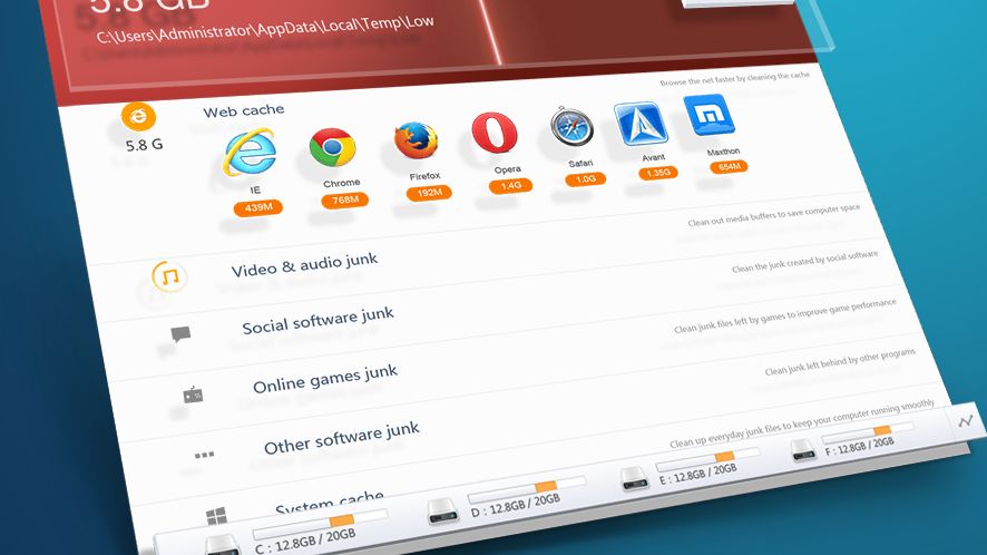 Po uruchomieniu Clean Mastera aplikacja dokonuje skanowania systemu w poszukiwaniu zbędnych danych. Aplikacja informuje o ilości śmieci w koszu systemowym, katalogach Windowsa, logach działania i raportach, a także danych tymczasowych i zbuforowanych. Umożliwia ponadto oczyszczanie dedykowanych aplikacji z Microsoftu jak np. sklep Metro w Windows 8, czy też klient pocztowy Windows Live Mail. Program rozpoznaje także popularne przeglądarki (np. Firefox, Internet Explorer, Chrome, Opera), oraz inne oprogramowanie firm trzecich: dane tymczasowe z pakietów ochronnych, pliki śledzące Adobe Flash Playera, Skype i czytników PDF. Producent chwali się, że jego aplikacja rozpoznaje ponad 500 popularnych aplikacji, co pozwala jej na usuwanie wszystkich zbędnych śmieci, jak również tymczasowych danych tworzonych podczas przeglądania stron internetowych.