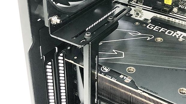 Wspornik umożliwia regulację zarówno w pionie (122 mm) jak i w poziomie (100 mm) więc da się go dostosować do każdej karty graficznej wliczając to takie monstra jak niektóre karty GeForce RTX 3090 Ti zajmujące aż cztery sloty.