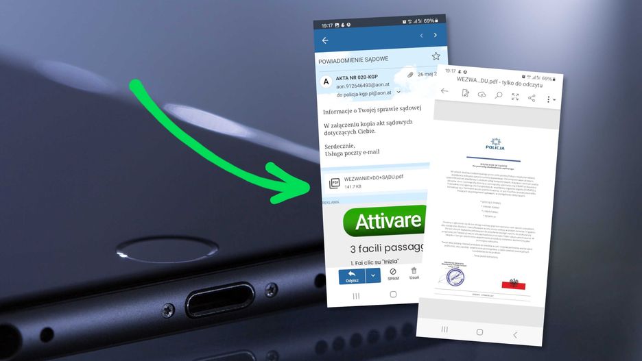 Do naszej czytelniczki Aleksandry dotarła krótka wiadomość z lakoniczną treścią. Nadawca podszywa się pod Policję i sugeruje, że w załączniku znajdują się niezbędne informacje związane z rzekomą rozprawą sądową. Plik to PDF z długą treścią, z której wynika, że odbiorca jest podejrzewany o posiadanie i rozpowszechnianie materiałów dla dorosłych. To znany scenariusz ataku - oszuści zachęcają do kontaktu pod podanym adresem e-mail, aby rzekomo rozwiązać sprawę polubownie.