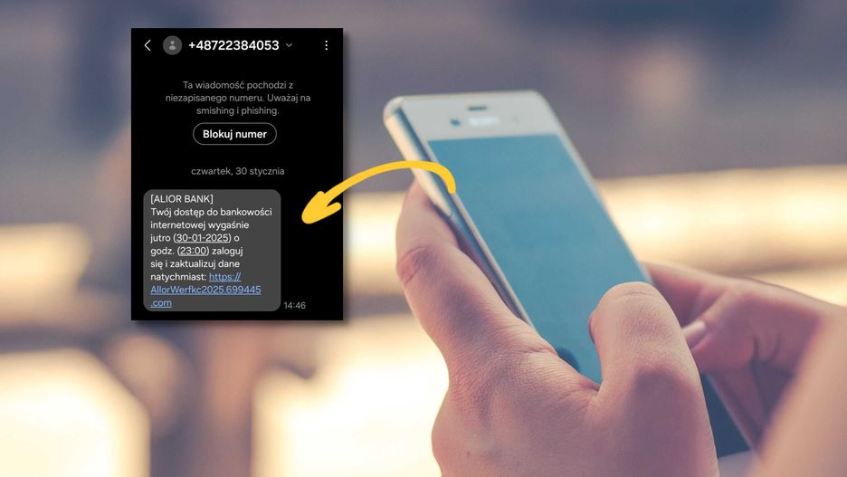 Nasz czytelnik Ryszard dostał wiadomość SMS z nieznanego numeru, której nadawca podszywa się pod Alior Bank. Treść sugeruje, że jest to automatyczny komunikat z banku, ale to typowy smishing - próba zmuszenia odbiorcy do odwiedzenia fałszywej strony internetowej.