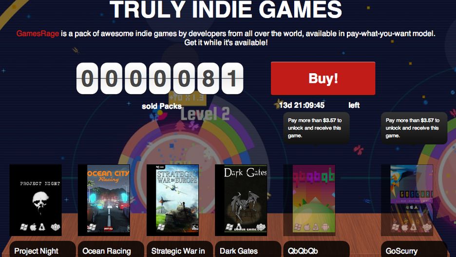 Pakiet podstawowy, za dowolną kwotę, zawiera:Project Night – survival horror w stylu gier z lat 90. Samotny, niewiedzący nic o sobie i miejscu w którym jesteś szukasz odpowiedzi na pytania „co się stało?”, „gdzie jestem?”, a przede wszystkim „kim jestem?”Ocean City Racing – oparta na Unreal Engine wyścigówka w ogromnym, otwartym świecie, z zaawansowaną fizyką i efektami graficznymi.Strategic War in Europe – wybierz jedno z 25 państw i poprowadź je ku zwycięstwu. Gra wyróżnia się brakiem limitu wykonanych akcji w trakcie tury, posiada 6 kampanii, a każda rozpoczyna się w kluczowym momencie danego okresu.Dark Gates – RPG, w którym gracz poprowadzi grupę sześciu herosów prosto do lochu złego maga. Lochy tworzą się w trakcie grania, za każdy razem są zupełnie inne, ale zawsze pełne potworów, pułapek, zagadek i magicznych przedmiotów.[yt=http://www.youtube.com/watch?v=1X5zQ5H3dcc]Gracze, którzy zapłacą kwotę powyżej średniej, otrzymają także: GoScurry - graczom przydadzą się zręczne palce i wyczucie rytmu, by poprowadzić statek po nieskończonej drodze zawieszonej w przestrzeni.QbQbQb – nietypowy tytuł, przypominający obrotowego Tetrisa. Gracz, obracając kulą, dopasowuje kolorami spadające klocki.