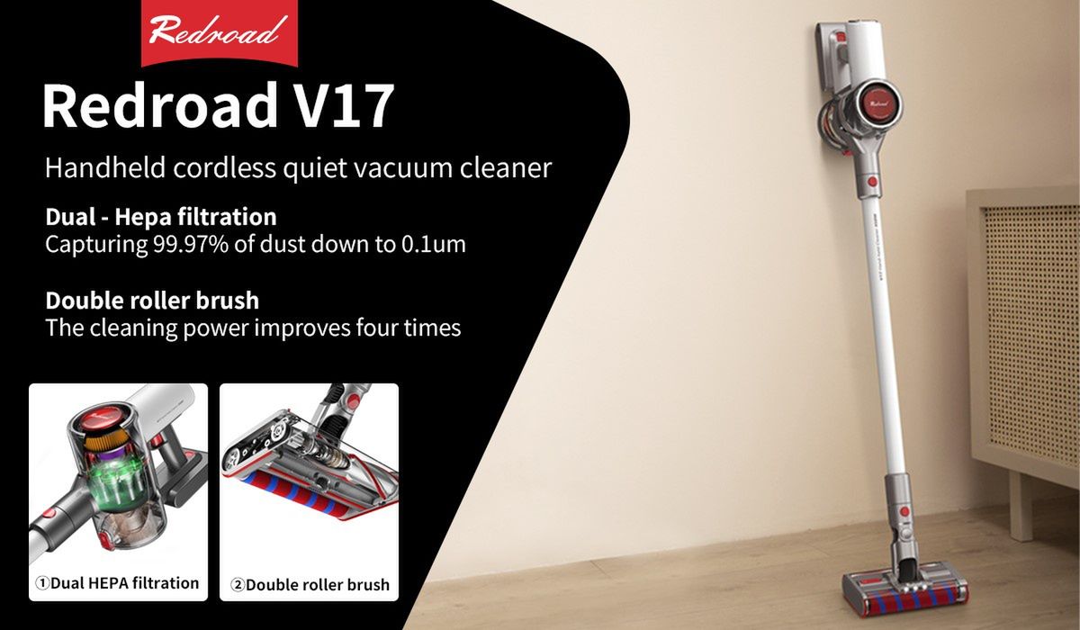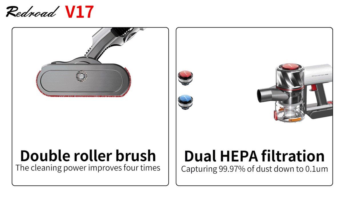 Redroad V17 wyposażono w 5-stopniowy system filtracji i podwójną szczotkę, która skutecznie usuwa zanieczyszczenia z różnych powierzchni i zapobiega powstawaniu wtórnego zanieczyszczenia powietrza w pomieszczeniu.