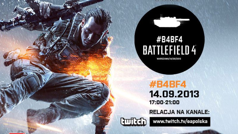Czekających na Battlefielda 4 i na bieżąco śledzących wszelkie materiały z rozgrywki, publikowane w sieci w formie wideo przez DICE oraz testerów tytułu, powinna zainteresować wiadomość, że w sobotę 14 września polskie Electronic Arts szykuje imprezę #B4BF4 dla krajowych maniaków serii. Co prawda przygotowana ona została z myślą o szczęśliwcach wytypowanych w ramach konkursu, którzy zmierzą się ze sobą we wczesnej wersji strzelanki, ale emocje nie ominą także internautów — a to za sprawą planowanego strumienia na żywo. Relacja odbędzie się na kanale twitch EAPolska.