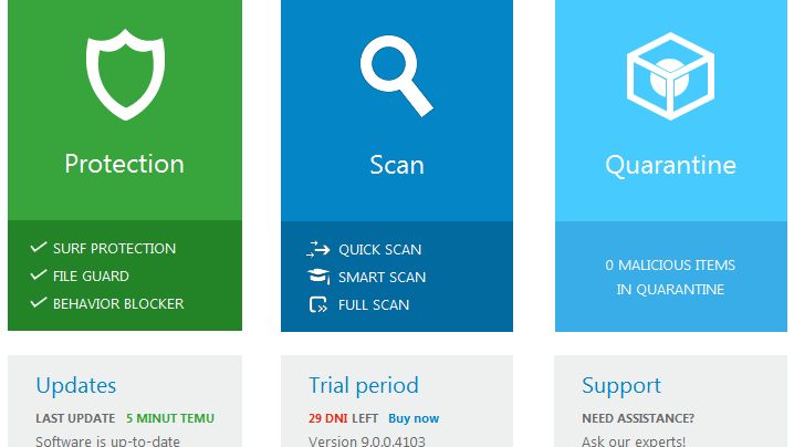 Dotychczasowi użytkownicy od razu zauważą gigantyczną zmianę. Producent zdecydował się zupełnie przebudować interfejs. Obecnie nie przypomina on już komnaty tajemnic, oprogramowania z ogromną ilością różnych ustawień, koniecznego do mozolnego rozszyfrowywania. Firma sięgnęła po modne elementy znane z Modern UI – płaski interfejs, niewielką ilość mocno kontrastowych kolorów, oraz kafelki z najważniejszymi informacjami i opcjami. Nie oznacza to wcale, że aplikacja utraciła coś ze swoich możliwości. Nad głównymi opcjami znajdują się zakładki, które pozwalają nam szybko przejść do opcji skanowania, kwarantanny, modułu ochronnego, a także ustawień antywirusa. Aplikacja w efekcie stała się bardzo czytelna, spójność kolorystyczna jeszcze bardziej potęguje wrażenie, że zmiana byłą dobrą decyzją. Nieco gorzej wygląda spolszczenie, które jest niekompletne i w takim stanie definitywnie nie powinno być dołączane do programu. Nie wiemy, co kierowało producentem w tej sprawie.