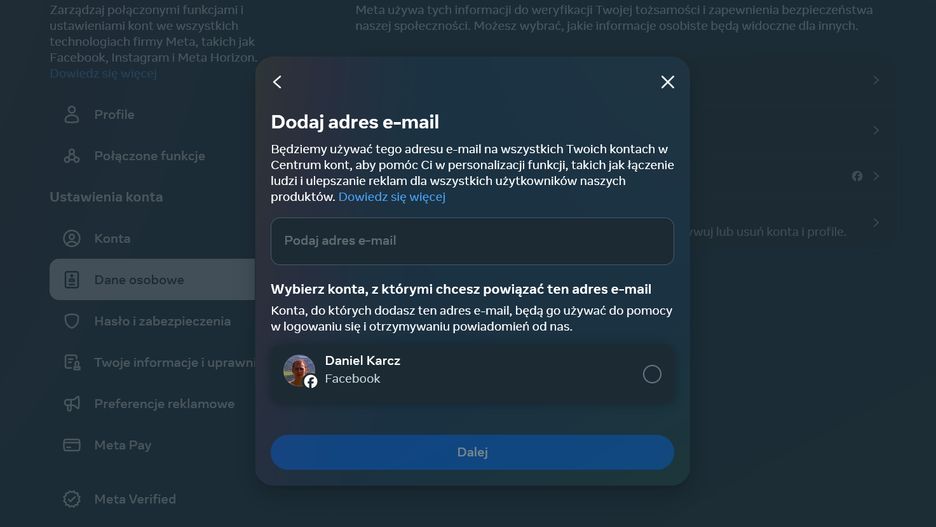 Ostatni krok to weryfikacja wprowadzonego adresu e-mail. W odpowiednim polu wpisz kod potwierdzający z wiadomości e-mail wysłanej pod wskazany wcześniej adres przez Facebooka i kliknij Dalej.