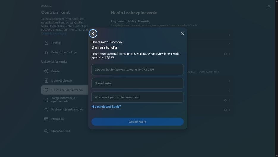 W sekcji menu po lewej stronie kliknij Centrum kont, Hasło i zabezpieczenia a następnie Zmień hasło.