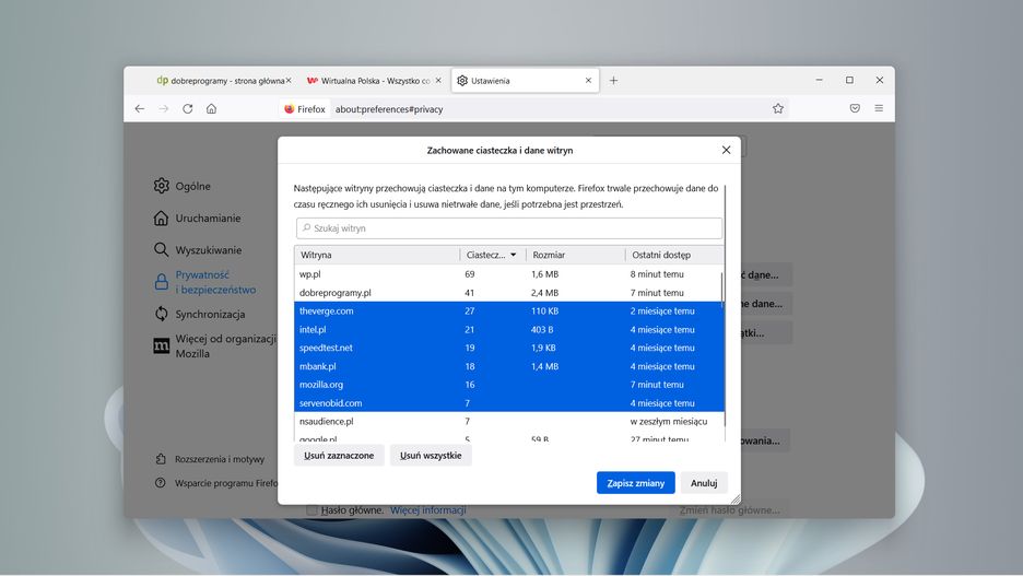 Na koniec klikamy Zapisz zmiany. Ciasteczka z wybranych witryn zostały usunięte z przeglądarki Firefox.