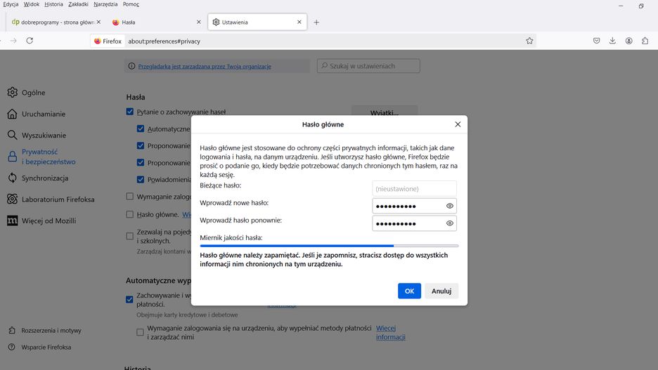Pamiętaj, że aby hasło było trudne do odgadnięcia powinno zawierać jak największą ilość znaków, duże i małe litery, cyfry oraz znaki niealfanumeryczne. Zapamiętaj zdefiniowane hasło. Jego utrata spowoduje brak dostępu do danych nim chronionych w przeglądarce Firefox na danym urządzeniu.
