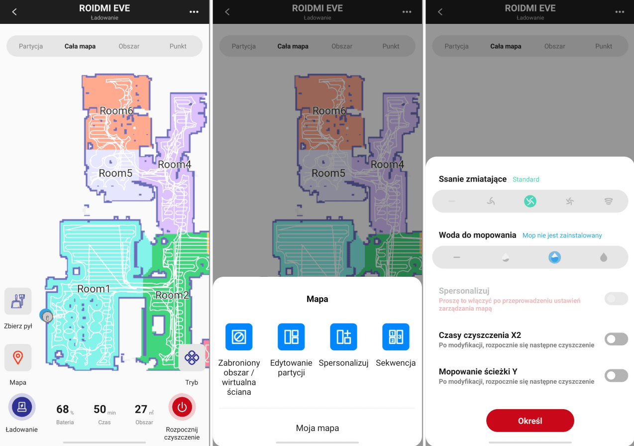 Aplikacja Roidmi Cleaner wskazuje status naładowania akumulatora czy czas trwania ostatniego sprzątania. Panel kontrolny robota pozwala wskazać obszar sprzątania i obszar zakazany (możemy stawiać wirtualne ściany, a także wskazywać kolejność sprzątanych pomieszczeń).