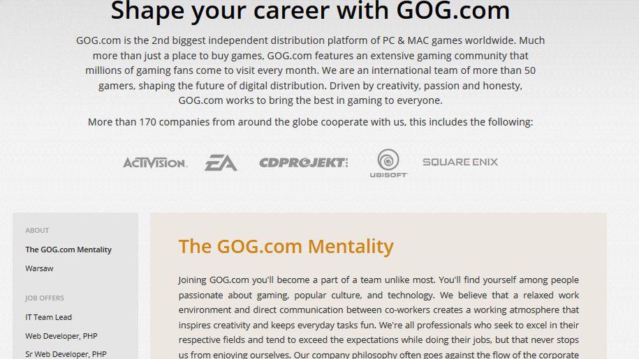 Jeżeli gry komputerowe są waszą pasją, mieszkacie w Warszawie (bądź nie macie nic przeciwko zamieszkaniu tam), a do tego szukacie pracy, to macie doskonałą okazję dostać się do GOG.com, które ogłosiło na swojej stronie głównej, że poszukuje nowych pracowników.