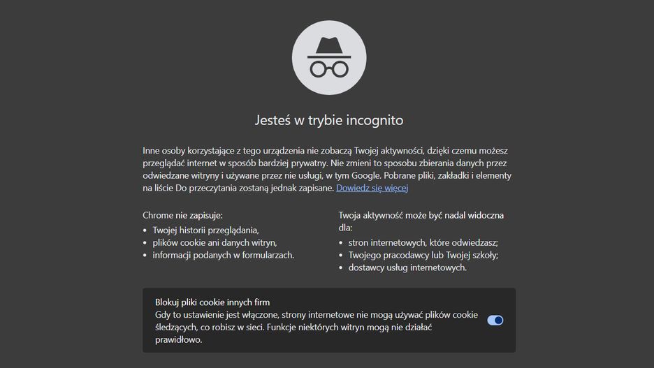 Po włączeniu trybu incognito w przeglądarce otworzy się nowe okno (w charakterystycznej ciemnej kolorystyce) z odpowiednim oznaczeniem (ikona okularów i kapelusza).