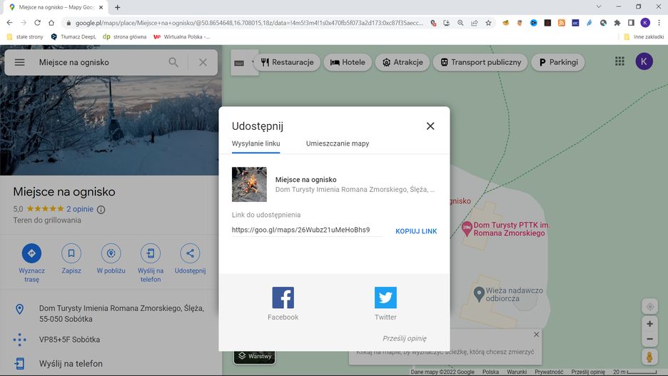 To właśnie we współrzędne klikamy. Po lewej stronie mapy pojawi się zakładka, na której wśród dostępnych możliwości jest klawisz Udostępnij. Po kliknięciu, w nowym oknie pojawi się link z naszą lokalizacją, który możemy wysłać przez dowolnego klienta poczty lub udostępnić w wiadomości prywatnej przez Facebooka czy Twittera.