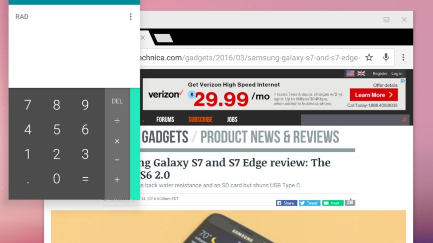 Ponadto możliwe jest także łączenie trybu okienkowego z widokiem dzielonego ekranu. Nic bowiem nie stoi na przeszkodzie, aby część ekranu zajmował pełny widok aplikacji, a drugą kilka okien w widoku pulpitowym. Już na tak wczesnym etapie cały mechanizm wygląda na dopracowany: możliwe jest obsługiwanie tego trybu myszką lub palcami w celu płynnej zmiany rozmiaru lub przesuwania okien. Zawartość nie skaluje się może zbyt ładnie, pojedyncze elementy interfejsu zmieniają rozmiar z opóźnieniem, nie wymagajmy jednak zbyt wiele od wczesnych wersji testowych.