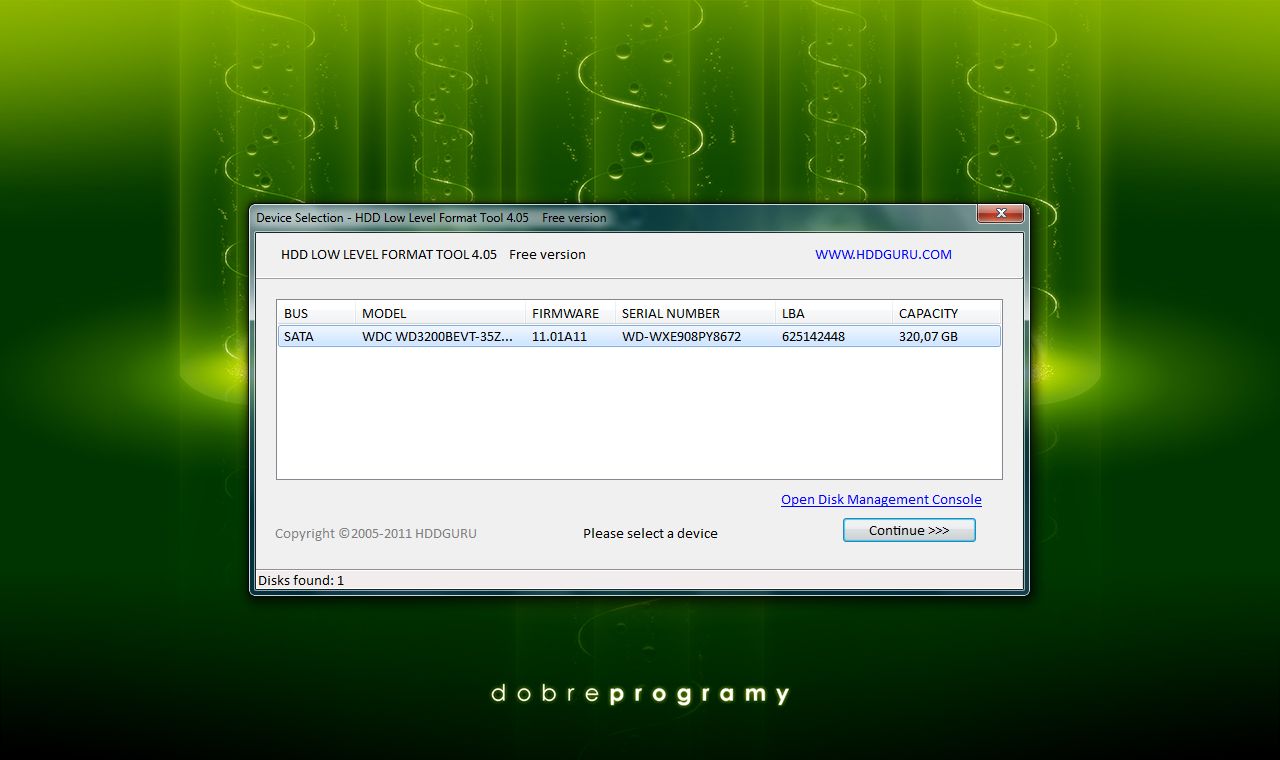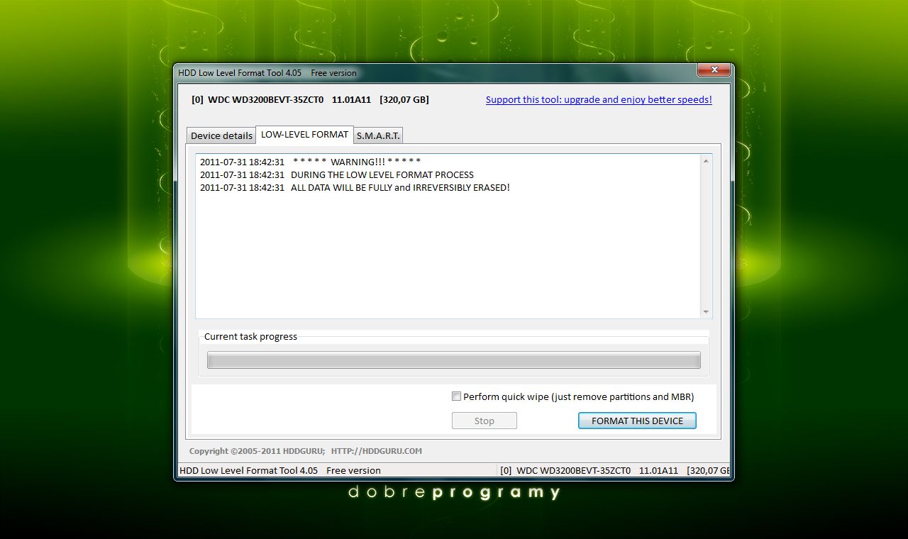 HDD Low Level Format Tool jest darmowym (do zastosowań domowych) narzędziem do niskopoziomowego formatowania dysków twardych, a także różnego rodzaju kart pamięci i zewnętrznych dysków USB/FireWire.