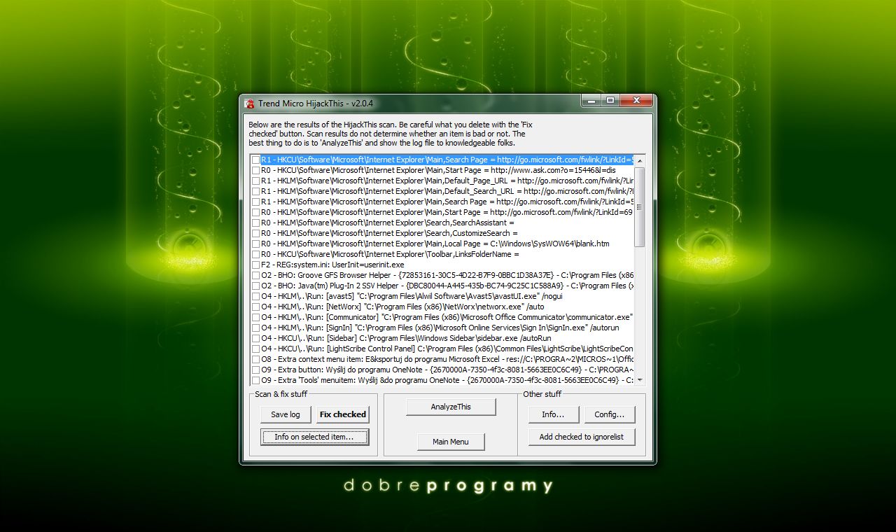 Nie zalecamy samodzielnego usuwania poszczególnych wykrytych wpisów, komponentów czy programów początkującym użytkownikom. Na naszym forum można uzyskać pomoc dotyczącą raportów generowanych przez program.