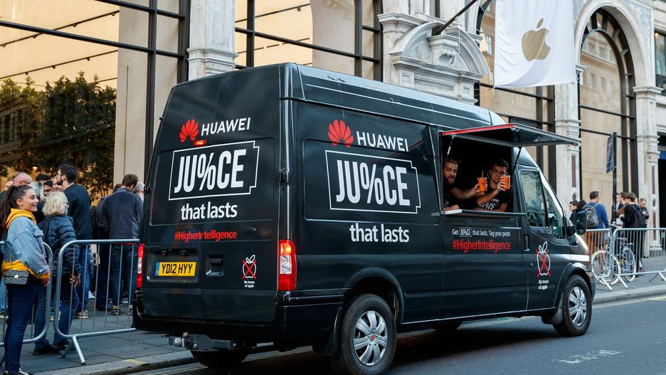 Co więcej, przed sklepem Apple w Londynie pojawił się samochód z napisem Ju%ce Van. Został on przygotowany do naładowania wszystkich iPhone’ów XS, które mogą potrzebować energii już po opuszczeniu Apple Store. Angielski oddział Huaweia poinformował na oficjalnym koncie na Twitterze, że w środku znalazły się także napoje, oczywiście bez śladów jabłek.