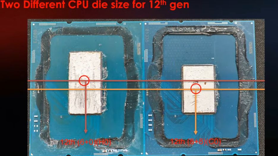Ciekawostką jest jednak to, że procesory stacjonarne będą bazować na 2 różnych wariatach rdzenia. Podczas streamu MSI Insider pokazano dwa nowe procesory Intela z serii Alder Lake pozbawione IHS-a (rozpraszacza ciepła), które istotnie różnią się wielkością (na 2 zdjęciach opisy MSI są błędne). Jako porównania użyto też zdelidowanego procesora poprzedniej generacji.