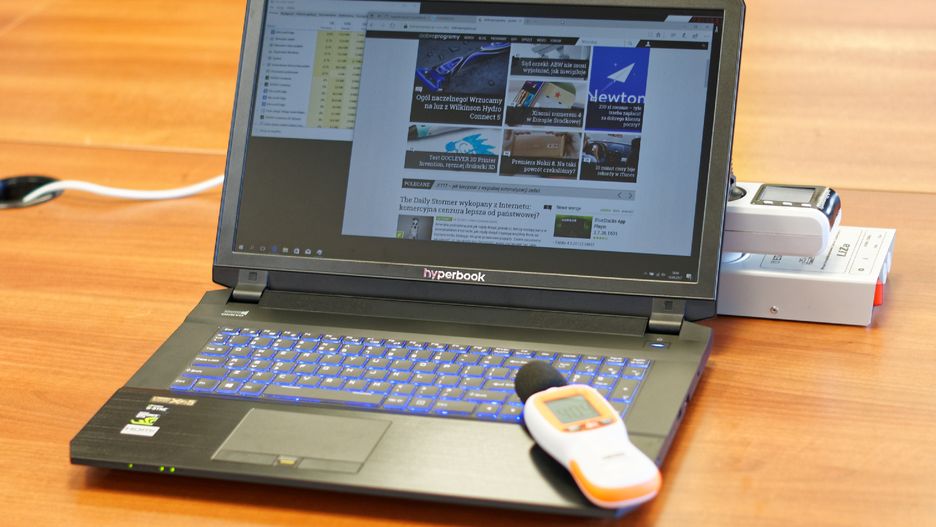 Na początek sprawdziliśmy jaki hałas Hyperbook generuje podczas minimalnego obciążenia. Gdy na notebooku przeglądamy strony i robimy coś, co nie wymaga pełnej wydajności jednostki, głośność pracy notebooka nie wybijała się ponad otoczenie. Wtedy na decybelomierzu najwyższa wartość, jaką zanotowaliśmy to 39,5 dB. Czyli w przyjętej ogólnie skali, coś pomiędzy szeptem a cichą rozmową w cichym biurze. Czyli takim jak nasze :) Głośność pracy chłodzenia nie jest męcząca nawet przez długi czas przebywanie dosłownie 50 cm od notebooka.