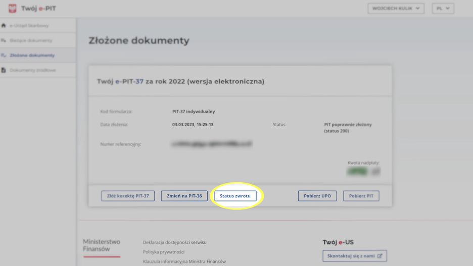 W to samo miejsce trafisz po kliknięciu przycisku "Status zwrotu" w sekcji "Złożone dokumenty" w usłudze Twój e-PIT (tej, o której wspominaliśmy przy okazji sprawdzania, na jakim etapie znajduje się PIT).
