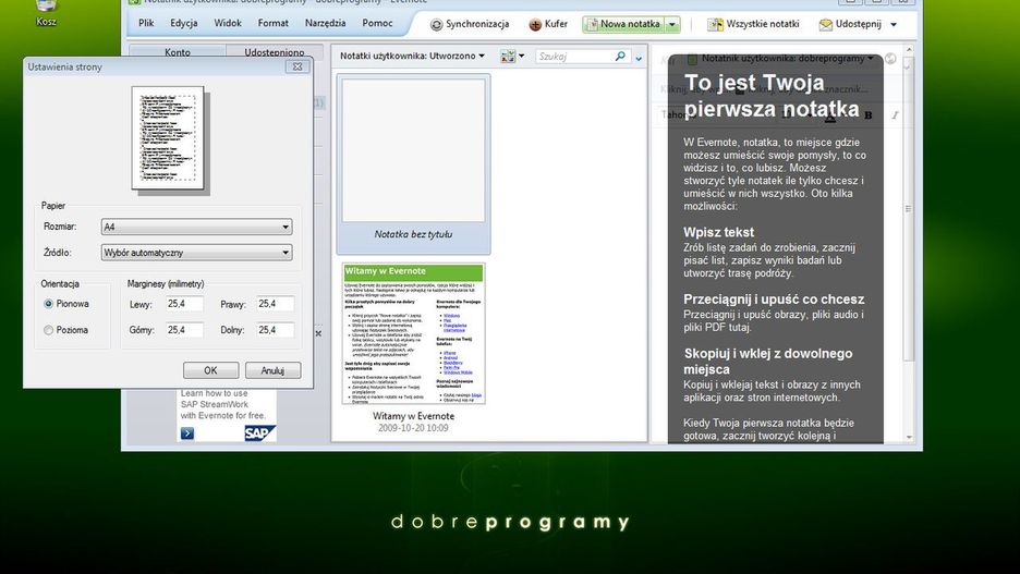 Plusy...łatwe przesyłanie plikówmożliwość rozbudowy darmowej przestrzeni podgląd plików online ...i minusybrak polskiej wersji językowejbrak edycji plików onlineNajciekawsze funkcjeobsługa proxyobsługa limitu przesyłu danychdzielenie się ze znajomymiNotatki, notatki - EvernoteTo nietypowe - w kontekście naszego zestawienia - narzędzie do przesyłania i synchronizacji danych. Jest bardziej notatnik online niż tradycyjna usługa typu Dropbox czy Syncplicity. Evernote pozwala na synchronizację i przechowywanie notatek, grafik, stron internetowych czy linków na wirtualnym koncie. Po co mielibyśmy coś takiego robić? Otóż, usługa ta świetnie sprawdza się, jeżeli chcemy mieć szybki dostęp do notatek niezależnie od urządzenia, z którego korzystamy. W prosty sposób z kontem możemy łączyć się z poziomu komputera (Windows, Mac OS X), jak i telefonu (iOS, Android), a także przeglądarki internetowej. Evernote ponadto posiada dodatki dla przeglądarek internetowych, za pomocą których jednym kliknięciem możemy zapisywać odwiedzone strony czy ciekawe artykuły w Sieci. Zachowany tekst można potem przejrzeć w innym urządzeniu, bądź podzielić się nim ze znajomym.
