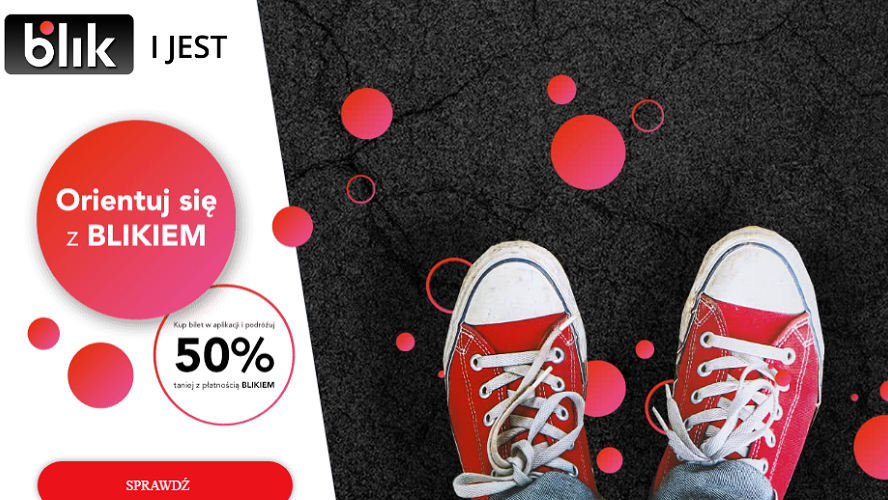 Po zapłaceniu BLIKIEM w aplikacji Jakdojade można skorzystać z aż 50-procentowego rabatu (maksymalnie 15 zł). Promocja obowiązuje od 11 grudnia 2017 do 10 stycznia 2018 lub do wyczerpania puli nagród. Można z niej korzystać w Trójmieście, Warszawie oraz Lesznie.