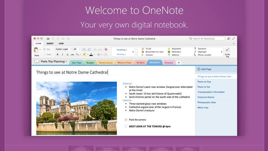 OneNote dostępny jest już dla Windows (także Modern) (za darmo!), Windows Phone, iOS, Androida oraz w wersji webowej. Dziś do tego zestawu dołączyło darmowe wydanie dla OS X. Podobnie jak inne programy Microsoftu, i ten został wyposażony we wstążkę. Każda notatka jest tu tworzona na „nieskończonym” tle, ale można wybrać dla nich bardziej przypominający zwykły notes styl. Program wyróżniają bogate możliwości formatowania tekstu, tabeli i list, a ważne informacje można oznaczyć odpowiednimi etykietami. Nie mogło zabraknąć możliwości dodawania do notatek obrazów.