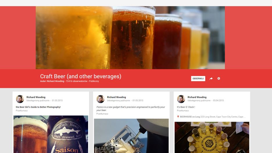 Standardowo Google nie tworzy na naszym koncie żadnych kolekcji, wyświetla jednak kolekcje użytkowników, jakich obserwujemy. Warto wspomnieć o nietypowym zachowaniu sieci. To my, jako autorzy kolekcji decydujemy, czy obserwujący nas użytkownicy zaczynają automatycznie obserwować kolekcję. Dziwne? To nie pierwszy tego typu mechanizm, podobnie działa informowanie o wpisach, którym przyznaliśmy +1 (odpowiednik polubienia z Facebooka). Również w jego wypadku to my ustalamy, czy informacja o takich wpisach ma być wyświetlana naszym obserwatorom. Mogłoby się wydawać, że początki istnienia kolekcji będą trudne, że nie znajdziemy wśród nich nic interesującego. Nic bardziej mylnego, już teraz istnieje wiele interesujących zbiorów. Coś dla siebie znajdzie zarówno piwosz, osoba zainteresowana tworzeniem stron internetowych, czy też fotografią makro. Wystarczy przejść do modułu kolekcji, a następnie wybrać zakładkę polecane, aby sprawdzić już istniejące grupy.