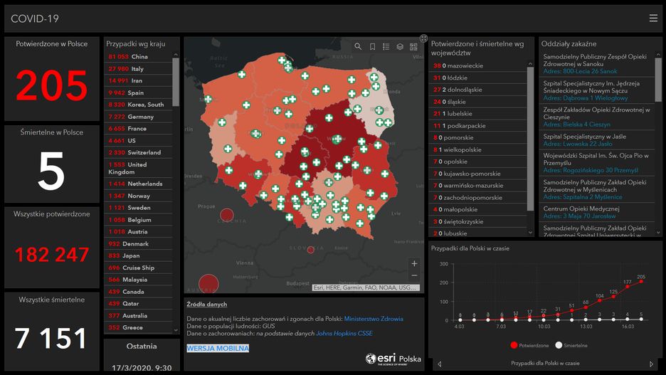 Wspomniana aplikacja opracowana została przez firmę Esri Polska i dostarcza na bieżąco aktualne dane o infekcjach koronawirusem na terenie naszego kraju (dostępne są również informacje o innych obszarach świata, jednak nie tak szczegółowe). Wszelakie prezentowane w jej obrębie dane pobierane są z takich instytucji jak Ministerstwo Zdrowia czy GUS i prezentowane w formie interaktywnej mapy oraz boksów z informacjami.