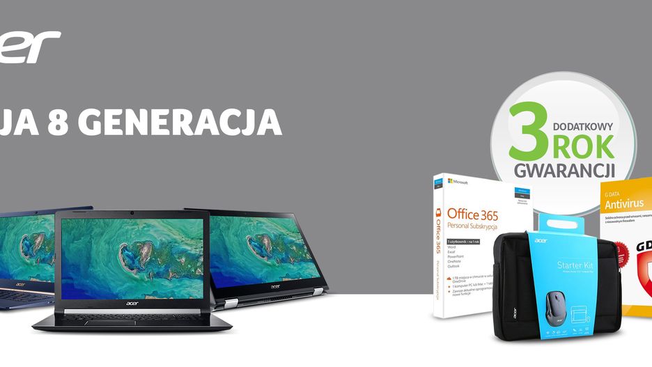 Jeśli planujesz zakup nowego laptopa, Acer ma dla ciebie ciekawą propozycję. Zachęcając do wyboru urządzeń z procesorami 8. generacji Intela, producent dodaje do każdego takiego zakupu zestaw cennych prezentów, w tym oprogramowanie i akcesoria sprzętowe. To oferta, która może się okazać ciekawa między innymi dla studentów i wiele wskazuje na to, że Acer właśnie w tę grupę klientów celuje: promocja już się rozpoczęła, a potrwa do 21 października lub do wcześniejszego wyczerpania zapasów.