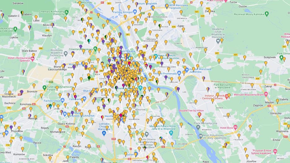 Kolejne stacje bazowe BTS wyświetlane są na mapie w formie kolorowych pinezek odpowiadających kolorom kojarzonym z operatorami komórkowymi. Wybierając zestaw danych po lewej można wygodnie zawęzić wyniki na mapie, by stała się bardziej czytelna, na przykład oczekując wyświetlenia jedynie nadajników LTE z obsługą pasma 1800 MHz sieci Orange czy wszystkich 5G T-Mobile.