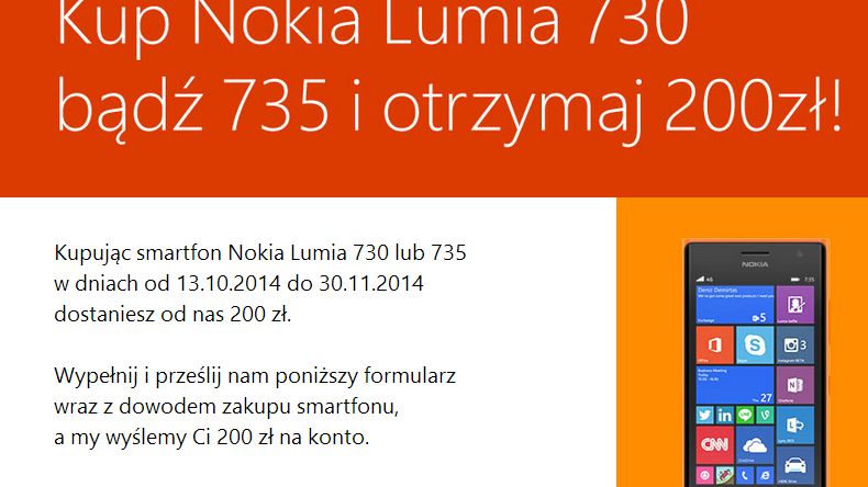 Polski oddział Microsoftu (a dawniej Nokii) nie ustaje w promowaniu telefonów z serii Lumia za pomocą nagród i dodatków dla osób, które zdecydują się na ich zakup. Były już darmowe aplikacje, kupony do sklepu Windows, zniżki do restauracji i regularne konkursy. Teraz przyszła pora na nagrodę pieniężną. Kupując Lumię 730 lub 735 możemy uzyskać 200 zł zwrotu na nasze konto.