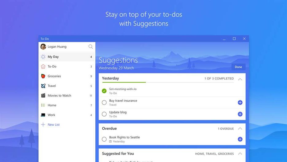 Microsoft To-Do to lista zadań do zrobienia, świetnie pasująca do Windowsa i Office'a. Plany na najbliższe dni są synchronizowane z Outlookiem, jednak nie tym zasłynęła aplikacja. Jej charakterystyczną cechą jest codzienne prezentowanie zaplanowanych na dany dzień zadań razem z sugestiami zaległych, ale ważnych spraw. Microsoft To-Do została oczywiście zaprojektowana zgodnie z wytycznymi Fluent Design.