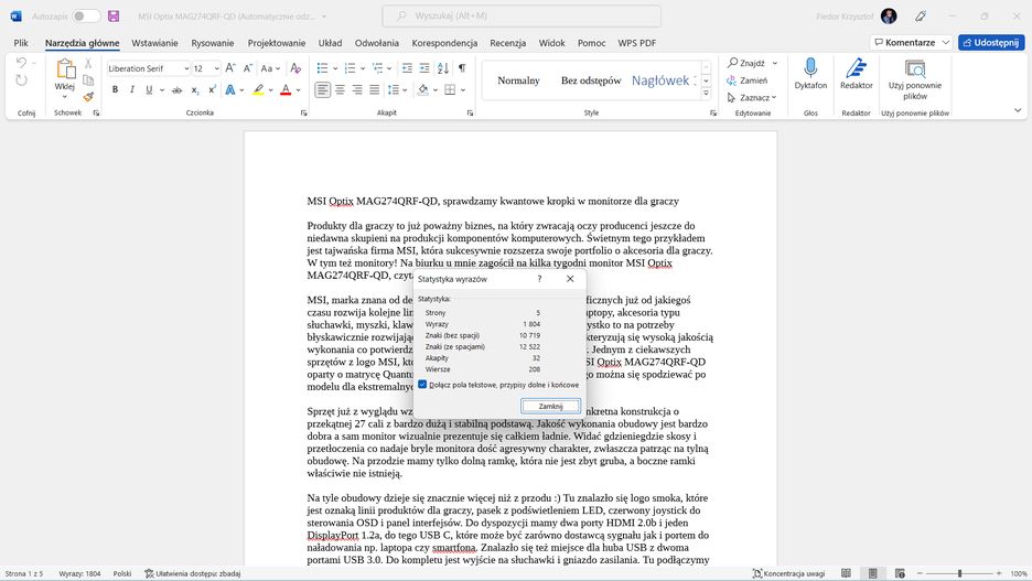 To klikalny element. Jedno kliknięcie lewym klawiszem myszki i pojawia się okno Statystyka wyrazów, gdzie znajdziemy interesujące nas statystyki publikacji.
