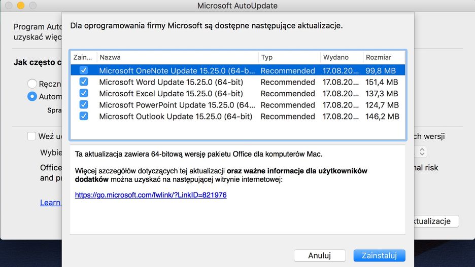 Szczegóły aktualizacji dostępne są na stronach wsparcia technicznego Microsoft. Z treści opisu wynika, że aktualizacja może powodować konflikty ze startymi, 32-bitowymi rozszerzeniami. Potencjalne problemy oraz sposób ich usunięcia można znaleźć w publikacji Error messages after updating to Office for Mac 64-bit. Sama aktualizacja pobiera się automatycznie przez narzędzie Microsoft AutoUpdate.