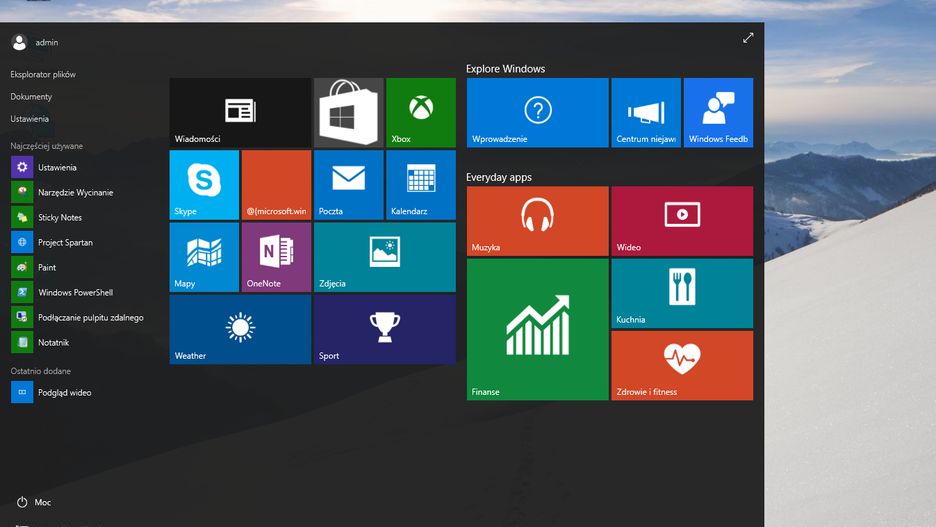 Spore zmiany zaszły również od strony możliwości personalizacji i wyglądu. W nowym panelu sterowania znajdziemy opcje odpowiedzialne za włączanie przezroczystości paska zadań, a także wybór koloru tła dla niego i menu start. Domyślnie jest on dostosowywany do aktualnie wyświetlanej tapety i wita nas ciemnymi barwami. Takie zobaczymy również w centrum powiadomień. Możemy już dowolnie zmieniać rozmiar menu start, w którym przycisk odpowiedzialny za opcje zasilania przeniesiono w lewy dolny róg (i co ciekawe, w tej kompilacji nosi on nazwę „Moc”). Usprawnienia pojawiły się również w funkcji Continuum: przełączenie do trybu tabletu powoduje, że pasek zadań jest lepiej dopasowany do dotyku, menu wyszukiwania zamienia się natomiast na przycisk. Uruchomienie tej funkcji powoduje, że automatycznie ukrywane są skróty do przypiętych i aktualnie pracujących aplikacji modern – to jest raczej działanie tymczasowe, które jeszcze zmieni się w przyszłości.