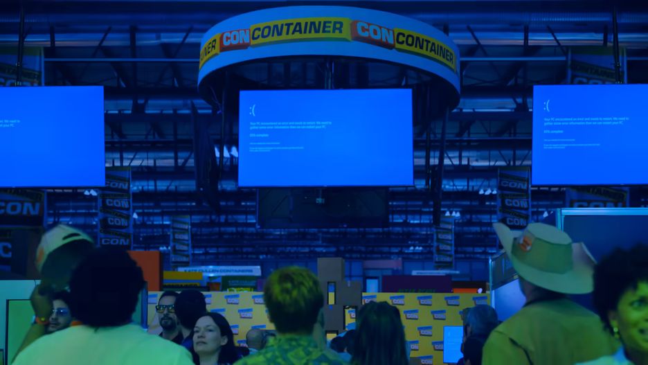 Po pewnym czasie jednak reklama zamienia się w otwarty atak na Windowsa. Ludzie panikują i zaczynają biegać po targach. Jednocześnie sala zdaje się przybierać niebieską barwę, ponieważ komputery zawieszają się z powodu niebieskiego ekranu.
