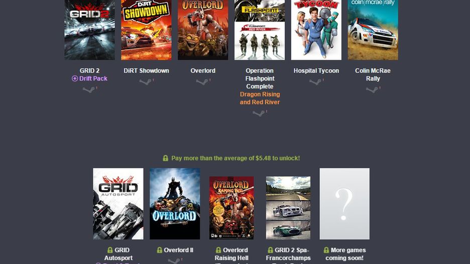 Jeśli zdecydujemy się wydać więcej niż średnia wpłat, czyli obecnie 5,48 dolarów, to oczywiście dostaniemy kolejne gry. W skład tej droższej paczki wchodzą dodatkowo GRID: Autosport z dodatkiem Road & Track Car Pack, Overlord II, Overlord Raising Hell oraz GRID 2 Spa- Francorchamps Track Pack. To nie koniec, lista ma zostać zwiększona o jeszcze nieujawnione gry.